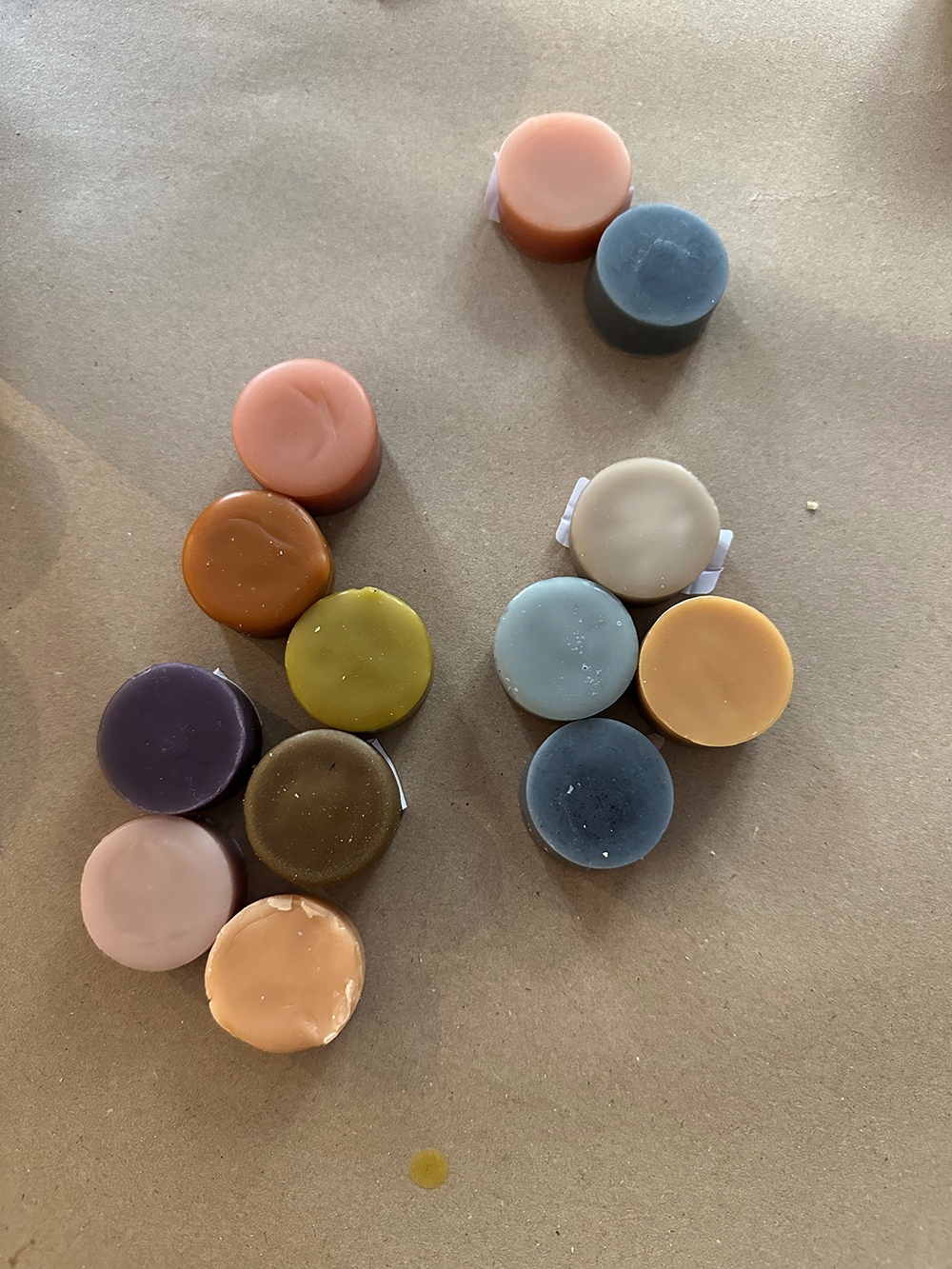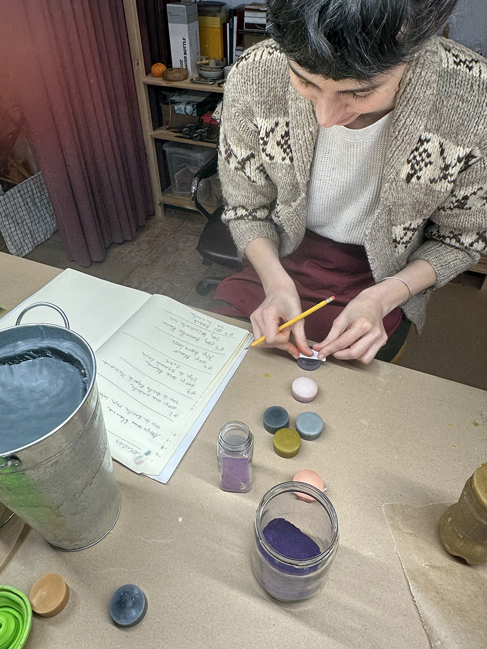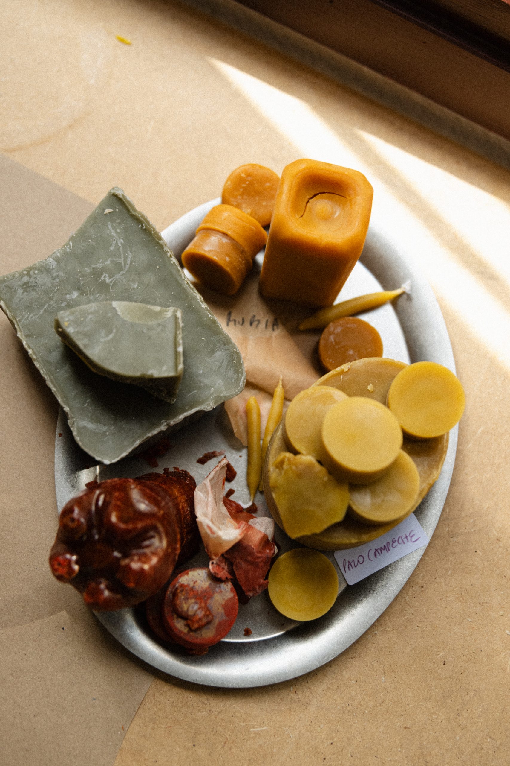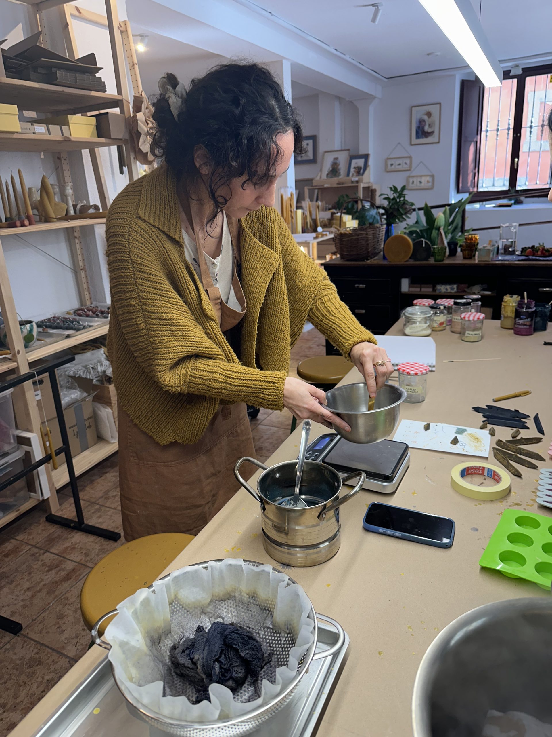 Hace unos meses vino a hacer pruebas con sus arcillas y pigmentos sobre nuestra cera de abeja. Fue un proceso mágico. Como ella dice, los colores que vienen de las plantas comparten una base que hace que las combinaciones fluyan de manera natural, casi sin esfuerzo y que todas las combinaciones sean preciosas.