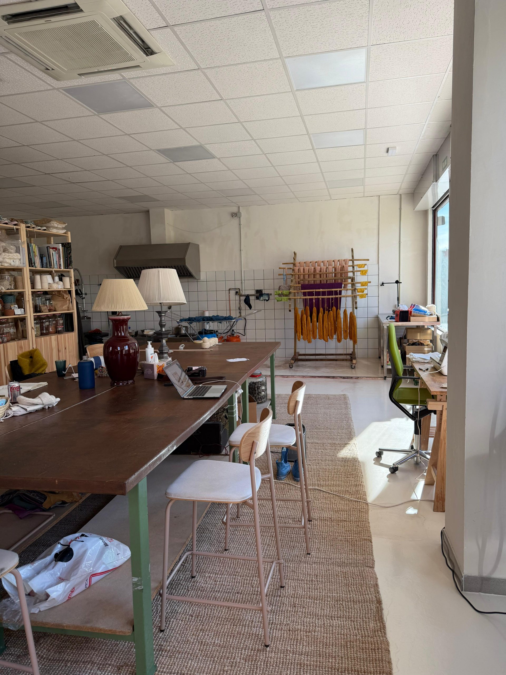 Su taller es uno de esos lugares donde el tiempo se detiene: un espacio lleno de materiales, telas, lanas y colores, muchos… muchos colores, donde te quedarías todo el día. Ha teñido un montón lana merino de Huelva en una gama de colores increíble, todos tan bonitos que cuesta elegir con cual quedarse.
